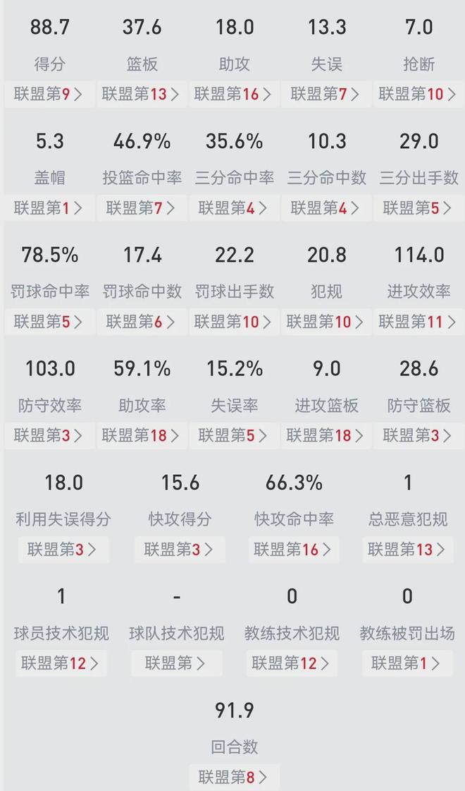 沒有楊瀚森的青島隊,竟然還那么猛,迄今為止場均得分88.7聯(lián)盟第九,場均三分命中數(shù)(10.3)&命中率(35.6%)均是第四,進攻節(jié)奏92.1第八,防守效率103.0第三,利用失誤得分18.0第三等等。